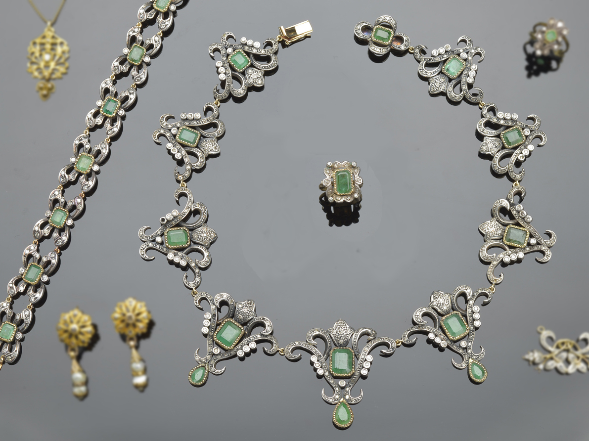 Importante collar de estilo isabelino, con 10 esmeraldas en su talla y 3 esmeraldas centrales talla perilla, brillantes talla 88 y diamantitos. En montura de oro amarillo 18 K con vistas de plata. Salida 2.400 €