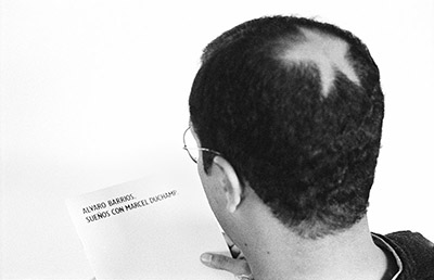 La obra de Álvaro Barrios, pionero en el arte conceptual en Colombia, también suscita la reflexión sobre la autoría y la identidad en sus acercamientos, muy diversos, a Marcel Duchamp, desde su interpretación del Gran Vidrio, a las fotografías que hacía a personas disfrazas de Duchamp y Rrose Sélavy o los trabajos experimentales de  la serie Sueños con Marcel Duchamp, que se explica en la web del artista colombiano: «En un principio esta obra funcionó como un grabado que se reprodujo en la prensa con la foto de perfil del artista francés, unas líneas para llenar en frente del rostro, la firma de Barrios y las instrucciones que invitaban al lector del diario a escribir un sueño. Posteriormente realizó una segunda versión de la misma obra donde el artista escribió sus propios «sueños», redactados con una caligrafía cuidadosa. En esos textos se construyen ficciones donde se relacionan los variados intereses de Barrios: la historia del arte, el esoterismo, la fantasía, lo surrealista, la idea como arte, todo expresado con gran sentido del humor». En Autorretrato disfrazado de artista se exponen alguno de estos sueños y un retrato al modo del que Man Ray tomó a Duchamp en el que Álvaro Barrios es el retratado -con una tonsura en la cabeza. y Óscar Monsalve el que retrata.