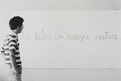 El refrán la letra con sangre entra está en el origen de otro trabajo, esta vez de Eduardo Hernández, en el que se puede intuir una crítica hacia una sociedad represiva. Hernández escribió con su propia sangre la frase y documentó, también a través de fotografías, el proceso desde que acudió a que la extrajeran sangre.