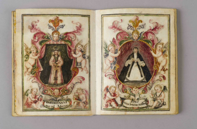 Ilustraciones de las vírgenes titulares de la cofradía de la Regla de la Hermandad de Nuestra Señora de la Esperanza y Santísimo Cristo de la Sentencia, 1720. Arriba, Rosa Aguilar, consejera de Cultura de la Junta de Andalucía, junto a Manuel García García, hermano mayor de la Hermandad de la Macarena, y uno de los restauradores del equipo del IAPH.