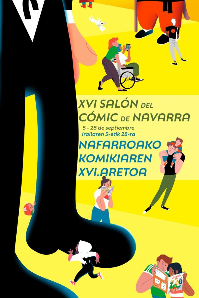 La autora barcelonesa Genie Espinosa firma el cartel anunciador de la XVIª edición del Salón de Cómic de Navarra, que se celebrará en Pamplona y Estella entre el 5 y el 28 de septiembre, con ese vibrante y colorido estilo que le ha convertido en voz imprescindible del cómic y la ilustración actuales. En su propuesta, una variedad de personajes camina entre protagonistas clásicos del noveno arte, representados a una escala gigante. Figuras tan emblemáticas que basta con una visión parcial para identificarlos.