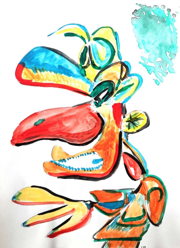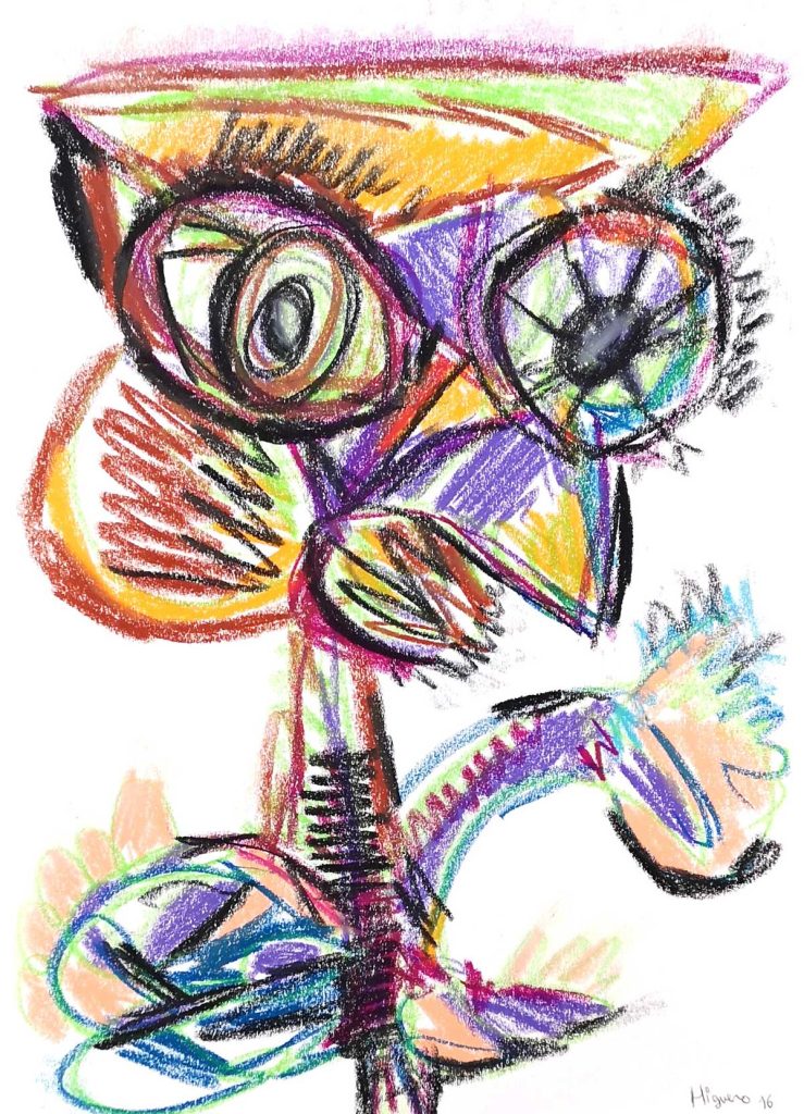 José Antonio Higuero (Sevilla, 1963) convierte el acto de dibujar en una forma de búsqueda espiritual. En sus propias palabras, intenta “encontrarse a sí mismo en cada cuadro”, y esa intención se percibe en la fuerza gestual, en la tensión entre lo caótico y lo ordenado, entre la deformación expresiva y la armonía emocional. Su arte brota de la vulnerabilidad y se sostiene en la fuerza de quien convierte la creación en un acto de resistencia.