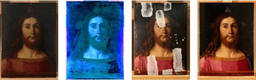 Proceso de restauración de la obra de Giovanni Bellini El Salvador, 1502. Fotos de Rafael Alonso, Alfonso Castrillo y Pablo Linés.